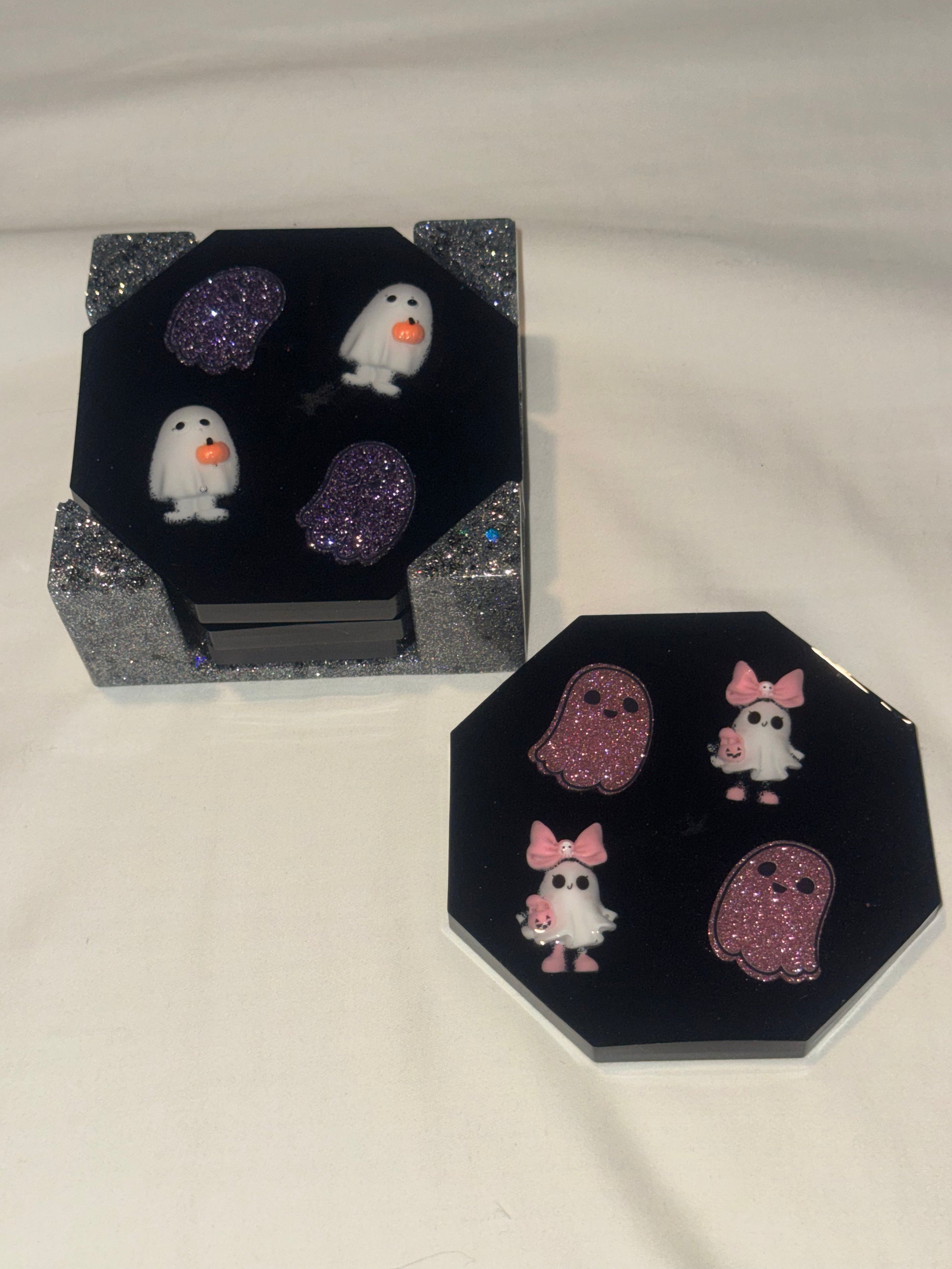 Spook up your home decor with our Ghost Coasters! These glittery ghost coasters will protect your furniture while adding a touch of whimsy. And with their own holder, they'll be a hauntingly convenient addition to your living room.