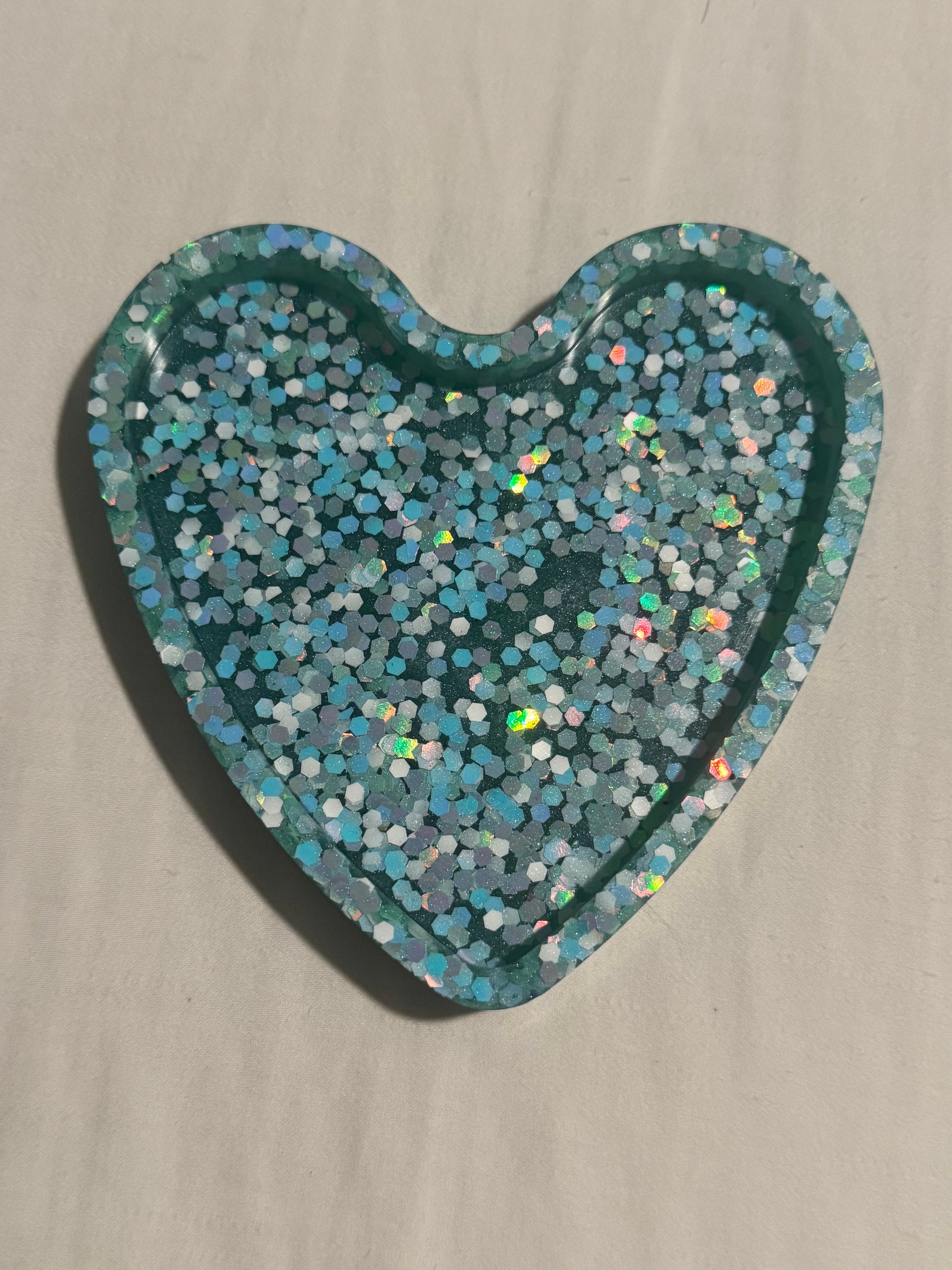 Looking for a little extra sparkle in your life? Look no further than our Glittery Heart Tray! This blue, green, and white tray is not only extremely glittery, but shaped like a heart for added charm. Perfect for holding your trinkets and keeping your space organized in a glitzy way.