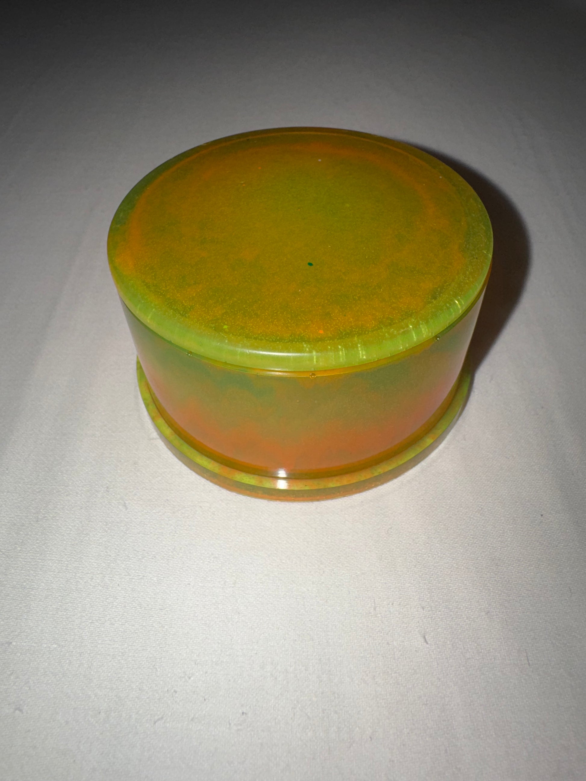 Add some color to your storage options with our Orange and Green Trinket Box! This playful marbled circle box is perfect for keeping all your trinkets and knick-knacks in one place. Say goodbye to boring storage solutions and hello to a fun and unique way to organize.