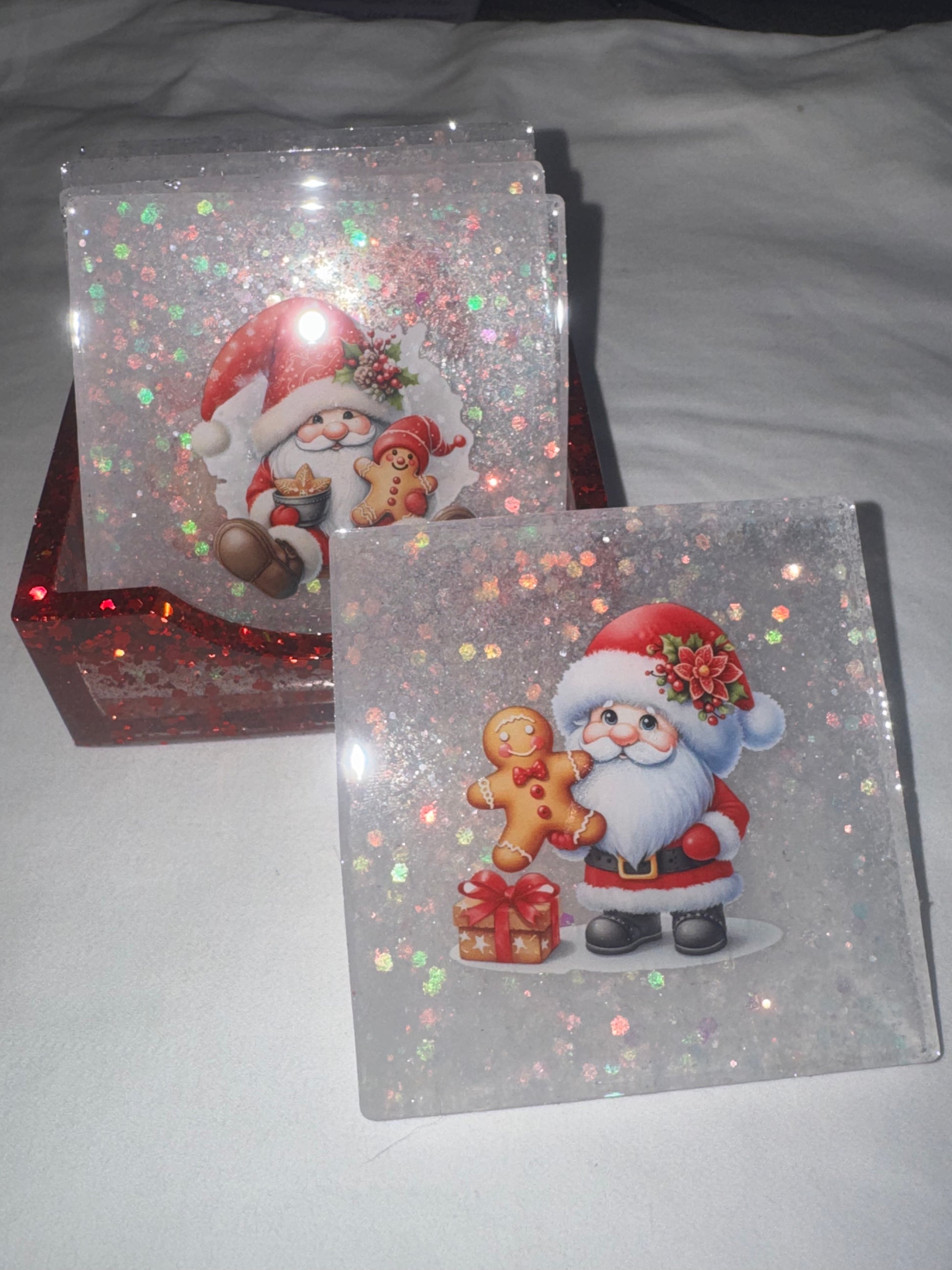 Brighten up your holiday décor with these Santa Snowy Square Coasters! Each coaster features a jolly Santa set against a wintry background, with a touch of red glitter for extra sparkle. Keep them organized with the included holder. A festive addition to your home!